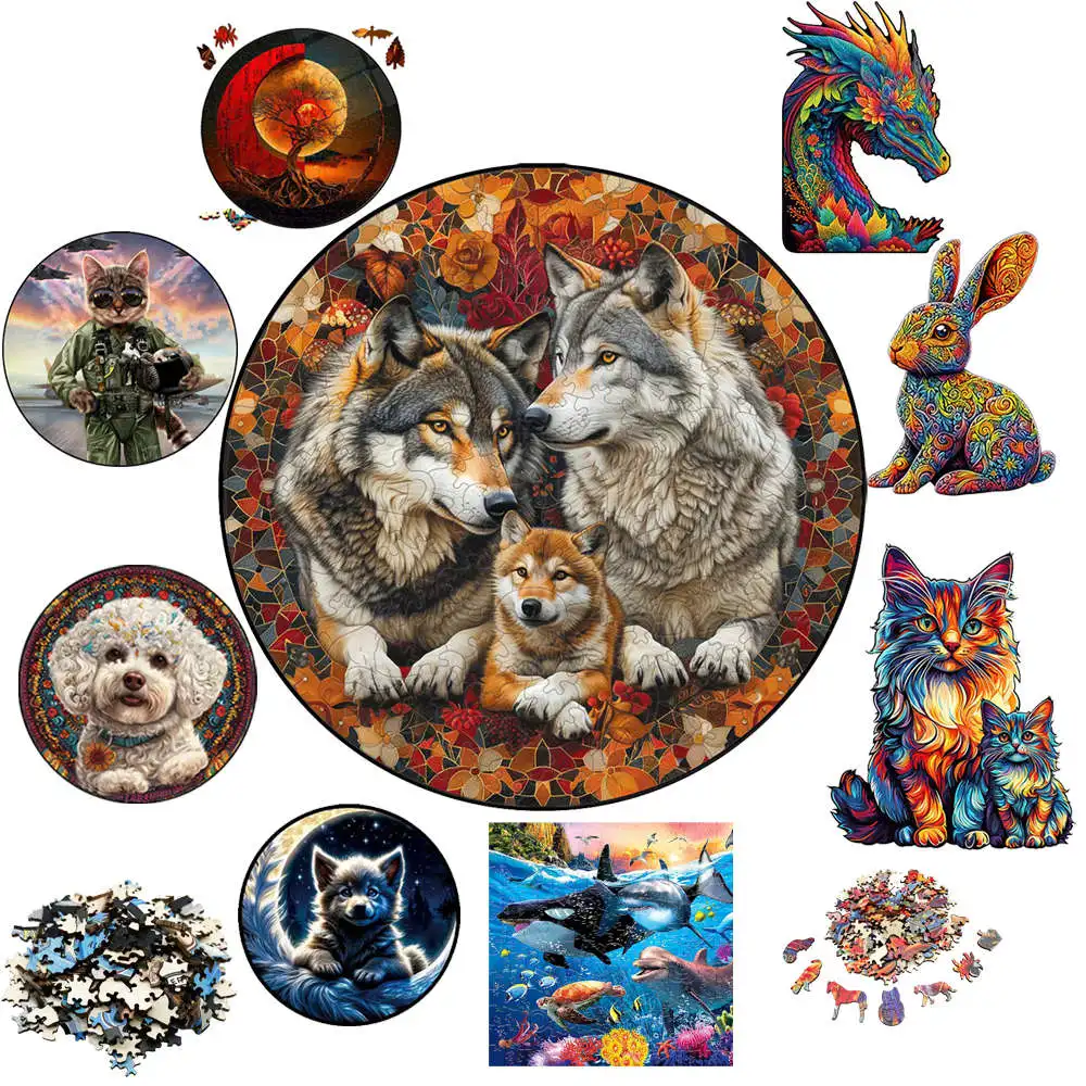 Here are some beautiful wooden animal puzzles, including sharks and wolves, with a range of styles and medium difficulty — great as gifts for kids, adults, puzzlers, or nature‑theme lovers: